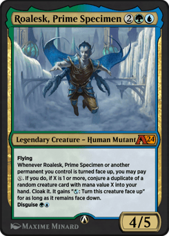 Flying Whenever Roalesk, Prime Specimen or another permanent you control is turned face up, you may pay {X}. If you do, if X is 1 or more, conjure a duplicate of a random creature card with mana value X into your hand. Cloak it. It gains "{G/U}: Turn this creature face up" for as long as it remains face down. Disguise {G}{U}