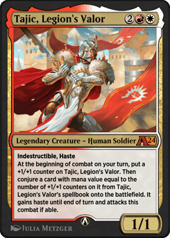 Indestructible, haste At the beginning of combat on your turn, put a +1/+1 counter on Tajic, Legion's Valor. Then conjure a card with mana value equal to the number of +1/+1 counters on it from Tajic, Legion's Valor's spellbook onto the battlefield. It gains haste until end of turn and attacks this combat if able.