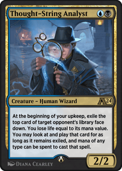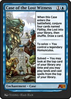 When this Case enters, conjure four cards named Fblthp, the Lost into your library, then shuffle. Draw a card. To solve — You control a legendary Homunculus. Solved — You may look at the top card of your library any time and you may play lands and cast spells from the top of your library.
