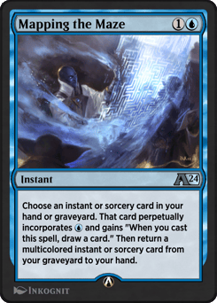 Choose an instant or sorcery card in your hand or graveyard. That card perpetually incorporates {U} and gains "When you cast this spell, draw a card." Then return a multicolored instant or sorcery card from your graveyard to your hand.