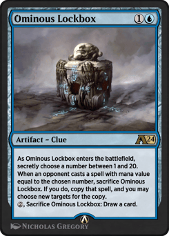 As Ominous Lockbox enters, secretly choose a number between 1 and 20. When an opponent casts a spell with mana value equal to the chosen number, sacrifice Ominous Lockbox. If you do, copy that spell, and you may choose new targets for the copy. {2}, Sacrifice Ominous Lockbox: Draw a card.