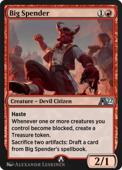Haste Whenever one or more creatures you control become blocked, create a Treasure token. Sacrifice two artifacts: Draft a card from Big Spender's spellbook.