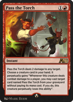 Pass the Torch deals 2 damage to any target. Choose a creature card in your hand. It perpetually gains "Whenever this creature deals combat damage to a player, you may cast target card named Pass the Torch from your graveyard without paying its mana cost. If you do, this creature perpetually loses this ability".