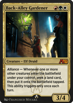 Alliance — Whenever one or more other creatures enter the battlefield under your control, seek a land card, then put it onto the battlefield tapped. This ability triggers only once each turn.