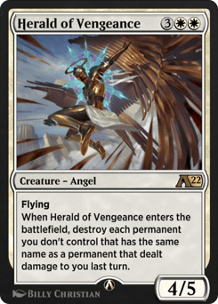 Flying When Herald of Vengeance enters the battlefield, destroy each permanent you don't control that has the same name as a permanent that dealt damage to you last turn.