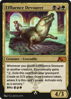 Whenever you sacrifice Effluence Devourer or another creature, it perpetually gains "{2}, Exile this card from your graveyard: Create an X/X green Ooze creature token, where X is this card's power. Activate only as a sorcery." Blitz {B}{R}{G} (If you cast this spell for its blitz cost, it gains haste and "When this creature dies, draw a card." Sacrifice it at the beginning of the next end step.)