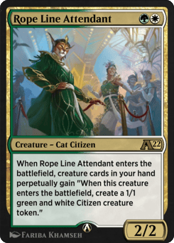When Rope Line Attendant enters the battlefield, creature cards in your hand perpetually gain "When this creature enters the battlefield, create a 1/1 green and white Citizen creature token."