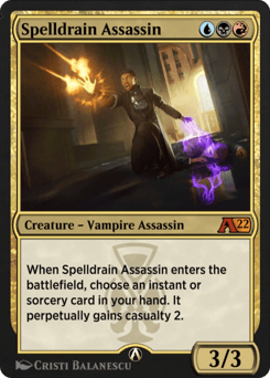 When Spelldrain Assassin enters the battlefield, choose an instant or sorcery card in your hand. It perpetually gains casualty 2. (As you cast this spell, you may sacrifice a creature with power 2 or greater. When you do, copy this spell and you may choose a new target for the copy.)