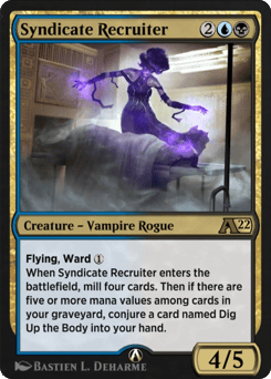 Flying, ward {1} When Syndicate Recruiter enters the battlefield, mill four cards. Then if there are five or more mana values among cards in your graveyard, conjure a card named Dig Up the Body into your hand.
