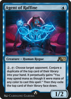 {2}, {T}: Choose target opponent. Conjure a duplicate of the top card of their library into your hand. It perpetually gains "You may spend mana as though it were mana of any color to cast this spell." Then they exile the top card of their library face down.
