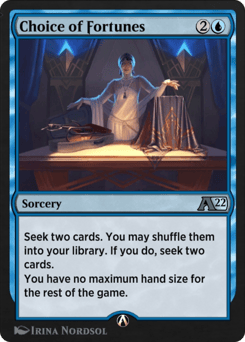 Seek two cards. You may shuffle them into your library. If you do, seek two cards. You have no maximum hand size for the rest of the game.