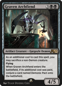 As an additional cost to cast this spell, you may sacrifice a non-Demon creature. Flying When Graven Archfiend enters the battlefield, if its additional cost was paid, conjure a card named Demonic Pact onto the battlefield.
