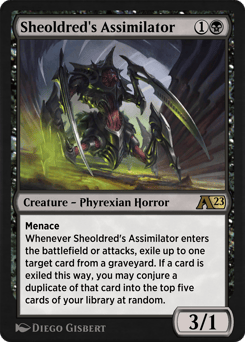 Menace Whenever Sheoldred's Assimilator enters or attacks, exile up to one target card from a graveyard. If a card is exiled this way, you may conjure a duplicate of that card into the top five cards of your library at random.