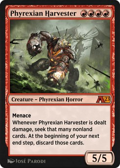 Menace Whenever Phyrexian Harvester is dealt damage, seek that many nonland cards. At the beginning of your next end step, discard those cards.