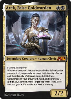 Starting intensity 0 Whenever another creature enters under your control, cards you own named Arek, False Goldwarden intensify by 1. {3}{W}{B}, {T}, Sacrifice Arek, False Goldwarden: Target opponent loses X life and you gain X life, where X is Arek's intensity.