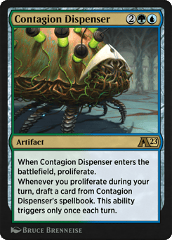 When Contagion Dispenser enters, proliferate. Whenever you proliferate during your turn, draft a card from Contagion Dispenser's spellbook. This ability triggers only once each turn.