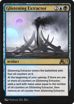 Glistening Extractor enters with four oil counters on it. At the beginning of your upkeep, if there are one or more oil counters on Glistening Extractor, seek a card with mana value equal to the number of oil counters on Glistening Extractor, then remove an oil counter from Glistening Extractor.