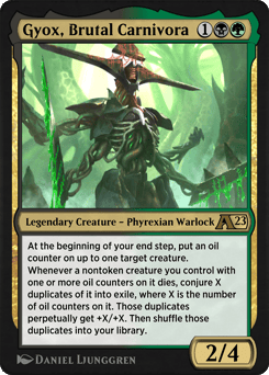 At the beginning of your end step, put an oil counter on up to one target creature. Whenever a nontoken creature you control with one or more oil counters on it dies, conjure X duplicates of it into exile, where X is the number of oil counters on it. Those duplicates perpetually get +X/+X. Then shuffle those duplicates into your library.