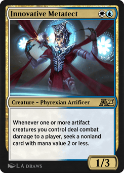 Whenever one or more artifact creatures you control deal combat damage to a player, seek a nonland card with mana value 2 or less.