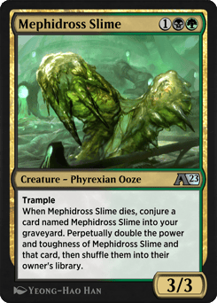 Trample When Mephidross Slime dies, conjure a card named Mephidross Slime into your graveyard. Perpetually double the power and toughness of Mephidross Slime and that card, then shuffle them into their owner's library.