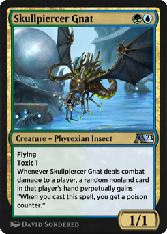 Flying Toxic 1 Whenever Skullpiercer Gnat deals combat damage to a player, a random nonland card in that player's hand perpetually gains "When you cast this spell, you get a poison counter."