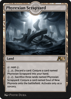 {T}: Add {C}. {1}, {T}, Discard a card: Conjure a card named Phyrexian Scrapyard into your hand. {2}, {T}, Sacrifice three lands named Phyrexian Scrapyard: Conjure a card named Soul of New Phyrexia onto the battlefield. Activate only as a sorcery.