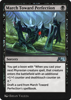 You get a one-time boon with "When you cast a Phyrexian creature spell, that creature enters with an additional +1/+1 counter and deathtouch counter on it." Draft a card from March Toward Perfection's spellbook.