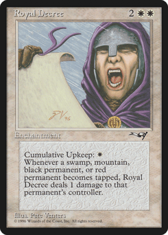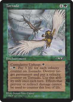 Cumulative upkeep—Pay 1 life. (At the beginning of your upkeep, put an age counter on this permanent, then sacrifice it unless you pay its upkeep cost for each age counter on it.) At the beginning of each player's upkeep, that player sacrifices a green or white permanent of their choice.