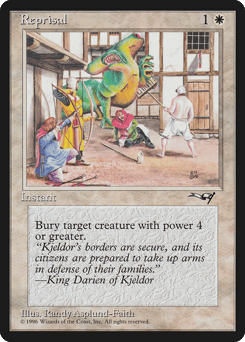 Return all Islands to their owners' hands. Each player sacrifices a Plains or a white permanent of their choice for each white permanent they control.