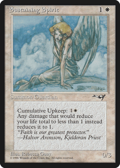 Cumulative upkeep {1}{W} (At the beginning of your upkeep, put an age counter on this permanent, then sacrifice it unless you pay its upkeep cost for each age counter on it.) Damage that would reduce your life total to less than 1 reduces it to 1 instead.