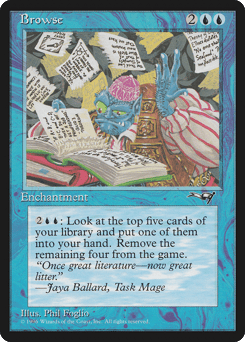 {2}{U}{U}: Look at the top five cards of your library, put one of them into your hand, and exile the rest.