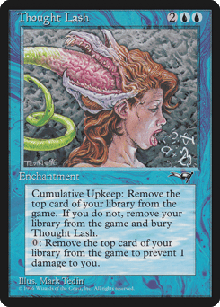 Cumulative upkeep—Exile the top card of your library. (At the beginning of your upkeep, put an age counter on this permanent, then sacrifice it unless you pay its upkeep cost for each age counter on it.) When a player doesn't pay this enchantment's cumulative upkeep, that player exiles all cards from their library. Exile the top card of your library: Prevent the next 1 damage that would be dealt to you this turn.