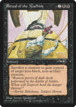 As an additional cost to cast this spell, sacrifice a creature. Gain control of target nonartifact, nonblack creature.
