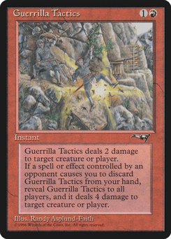Guerrilla Tactics deals 2 damage to any target. When a spell or ability an opponent controls causes you to discard this card, it deals 4 damage to any target.