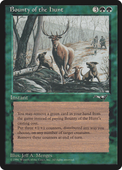 You may exile a green card from your hand rather than pay this spell's mana cost. Distribute three +1/+1 counters among one, two, or three target creatures. For each +1/+1 counter you put on a creature this way, remove a +1/+1 counter from that creature at the beginning of the next cleanup step.