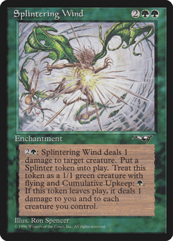 {2}{G}: This enchantment deals 1 damage to target creature. Create a 1/1 green Splinter creature token. It has flying and "Cumulative upkeep {G}." When it leaves the battlefield, it deals 1 damage to you and each creature you control. (At the beginning of its controller's upkeep, that player puts an age counter on it, then sacrifices it unless they pay its upkeep cost for each age counter on it.)