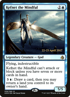Flying, indestructible Kefnet can't attack or block unless you have seven or more cards in hand. {3}{U}: Draw a card, then you may return a land you control to its owner's hand.