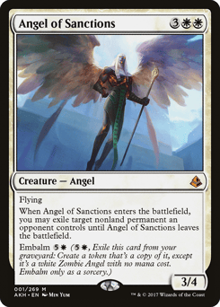 Flying When this creature enters, you may exile target nonland permanent an opponent controls until this creature leaves the battlefield. Embalm {5}{W} ({5}{W}, Exile this card from your graveyard: Create a token that's a copy of it, except it's a white Zombie Angel with no mana cost. Embalm only as a sorcery.)