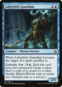When this creature becomes the target of a spell, sacrifice it. Embalm {3}{U} ({3}{U}, Exile this card from your graveyard: Create a token that's a copy of it, except it's a white Zombie Illusion Warrior with no mana cost. Embalm only as a sorcery.)