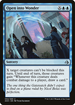 X target creatures can't be blocked this turn. Until end of turn, those creatures gain "Whenever this creature deals combat damage to a player, draw a card."
