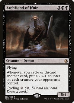 Flying Whenever you cycle or discard another card, put a -1/-1 counter on each creature your opponents control. Cycling {2} ({2}, Discard this card: Draw a card.)