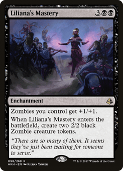Zombies you control get +1/+1. When this enchantment enters, create two 2/2 black Zombie creature tokens.