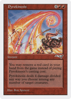 You may exile a red card from your hand rather than pay this spell's mana cost. Pyrokinesis deals 4 damage divided as you choose among any number of target creatures.