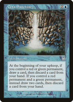 At the beginning of your upkeep, if you control a red or green permanent, draw a card, then discard a card. If you control a red permanent and a green permanent, instead draw two cards, then discard a card.