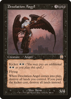 Kicker {W}{W} (You may pay an additional {W}{W} as you cast this spell.) Flying When this creature enters, destroy all lands you control. If it was kicked, destroy all lands instead.