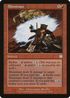 Kicker {2}{R} and/or {3}{U} (You may pay an additional {2}{R} and/or {3}{U} as you cast this spell.) Illuminate deals X damage to target creature. If this spell was kicked with its {2}{R} kicker, it deals X damage to that creature's controller. If this spell was kicked with its {3}{U} kicker, you draw X cards.