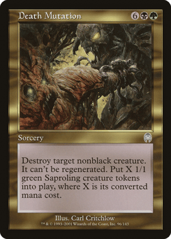 Destroy target nonblack creature. It can't be regenerated. Create X 1/1 green Saproling creature tokens, where X is that creature's mana value.