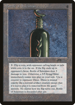 {1}, Sacrifice this artifact: Flip a coin. If you win the flip, create a 5/5 colorless Djinn artifact creature token with flying. If you lose the flip, this artifact deals 5 damage to you.