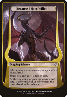 (An ongoing scheme remains face up until it's abandoned.) Spells you cast cost {1} less to cast. At the beginning of your opponents' end step, if they cast four or more spells this turn, abandon this scheme.