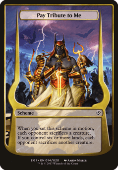When you set this scheme in motion, each opponent sacrifices a creature of their choice. If you control six or more lands, each opponent sacrifices another creature of their choice.